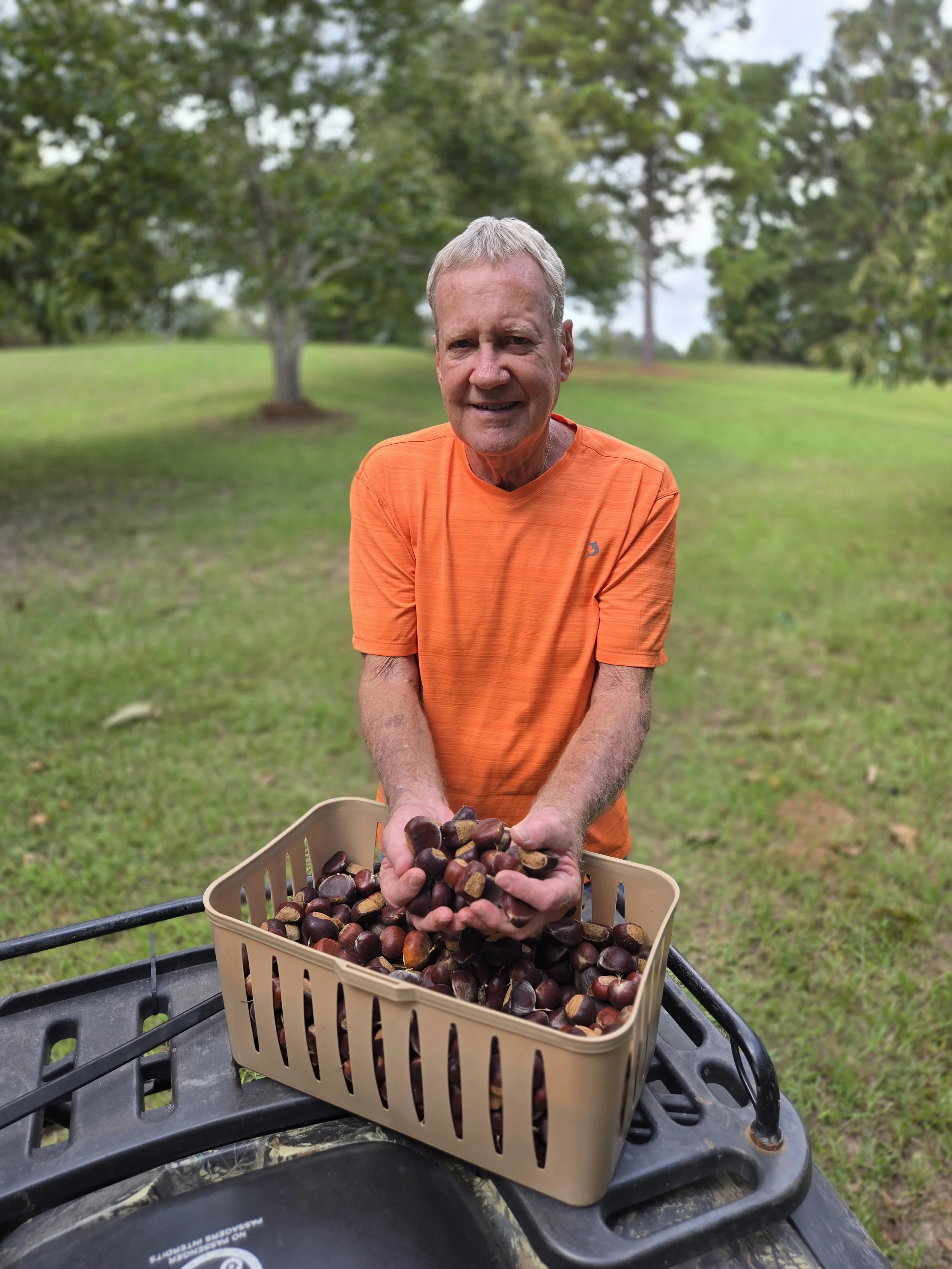 Every day, Ted is out walking the orchard, harvesting chestnuts, checking the trees, and preparing orders with care. Between packing boxes and hauling burrs, he's also working on a special presentation titled “What Happened to the American Chestnut?”